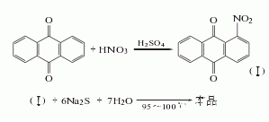 1.硝化還原法 蒽醌經(jīng)混酸硝化得硝基蒽醌,反應(yīng)產(chǎn)物過濾并用熱水洗至中性后,用亞硫酸鈉精制。其中2-硝基蒽醌與亞硫酸鈉生成易溶于水的蒽醌-2-磺酸鈉,過濾后洗滌除去之。所得1-硝基蒽醌用硫化鈉還原得1-氨基蒽醌粗品,經(jīng)加堿液、保險粉精制除去二氨基蒽醌后再用氧氣氧化、過濾、干燥,得成品。